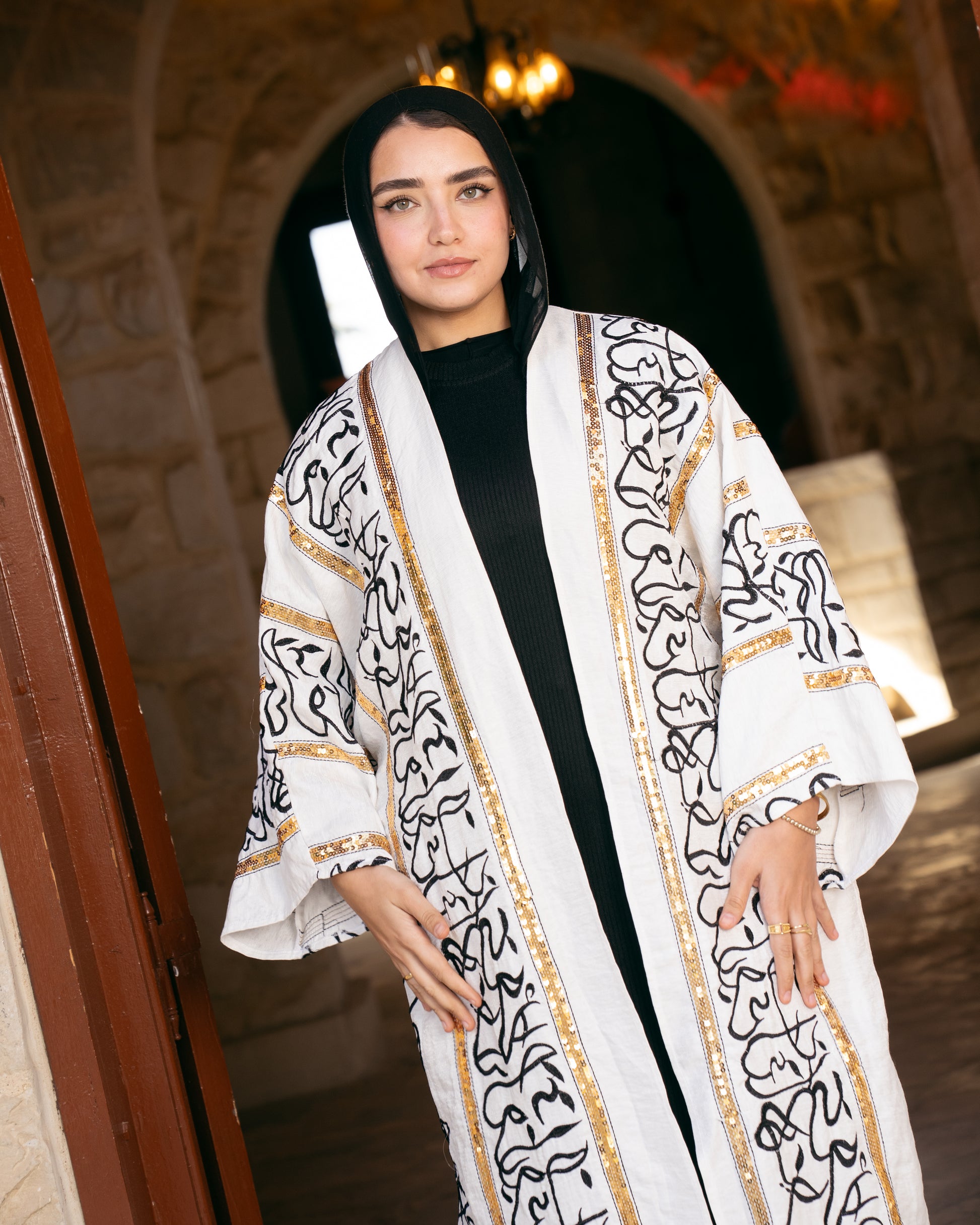 - Showcases a printed monochrome design featuring bold Arabic calligraphy that celebrates cultural artistry with a modern edge.