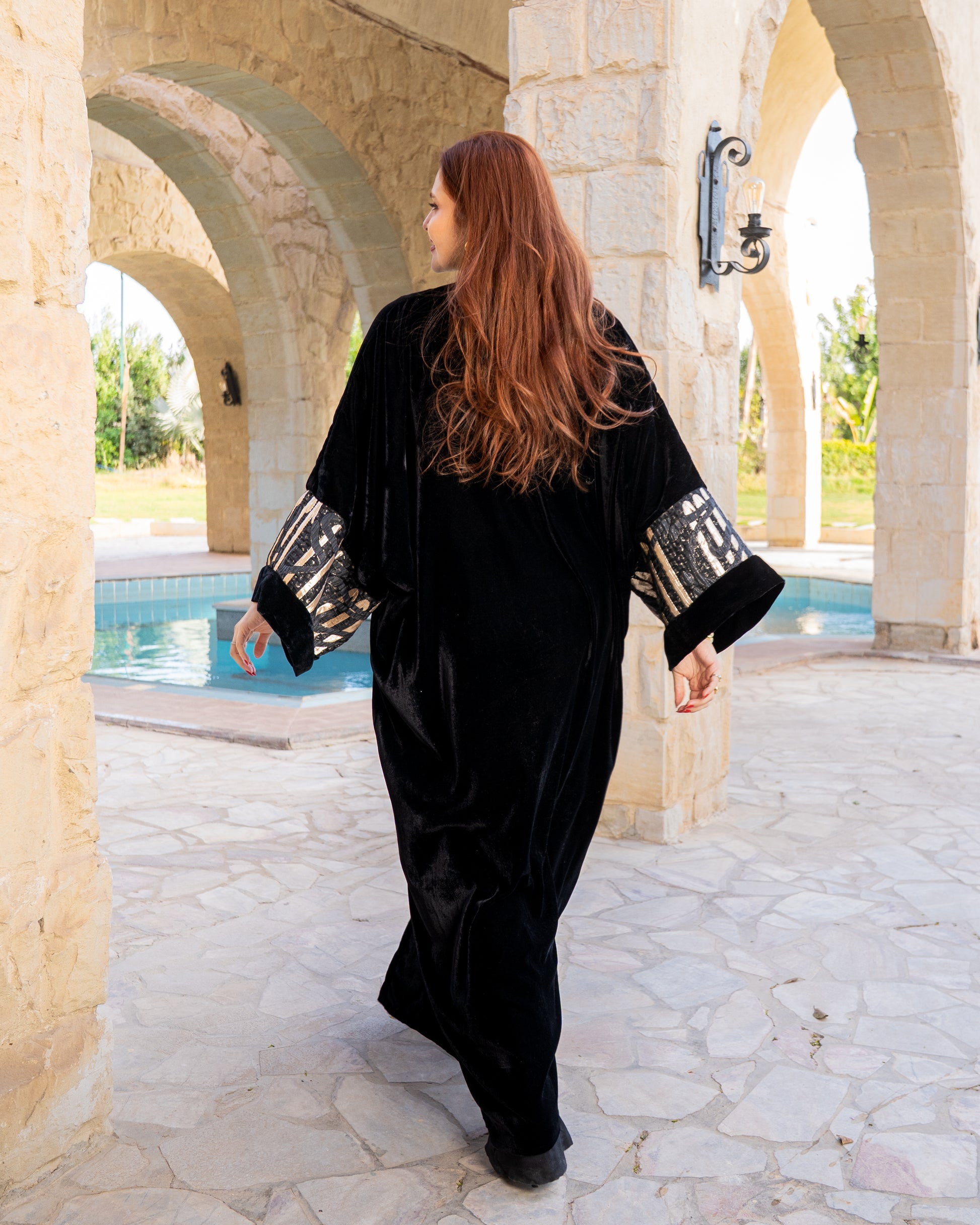 - Features dramatic flared cuffs adorned with a striking gold and silver calligraphy design, accented with shimmering sequins for an opulent touch.