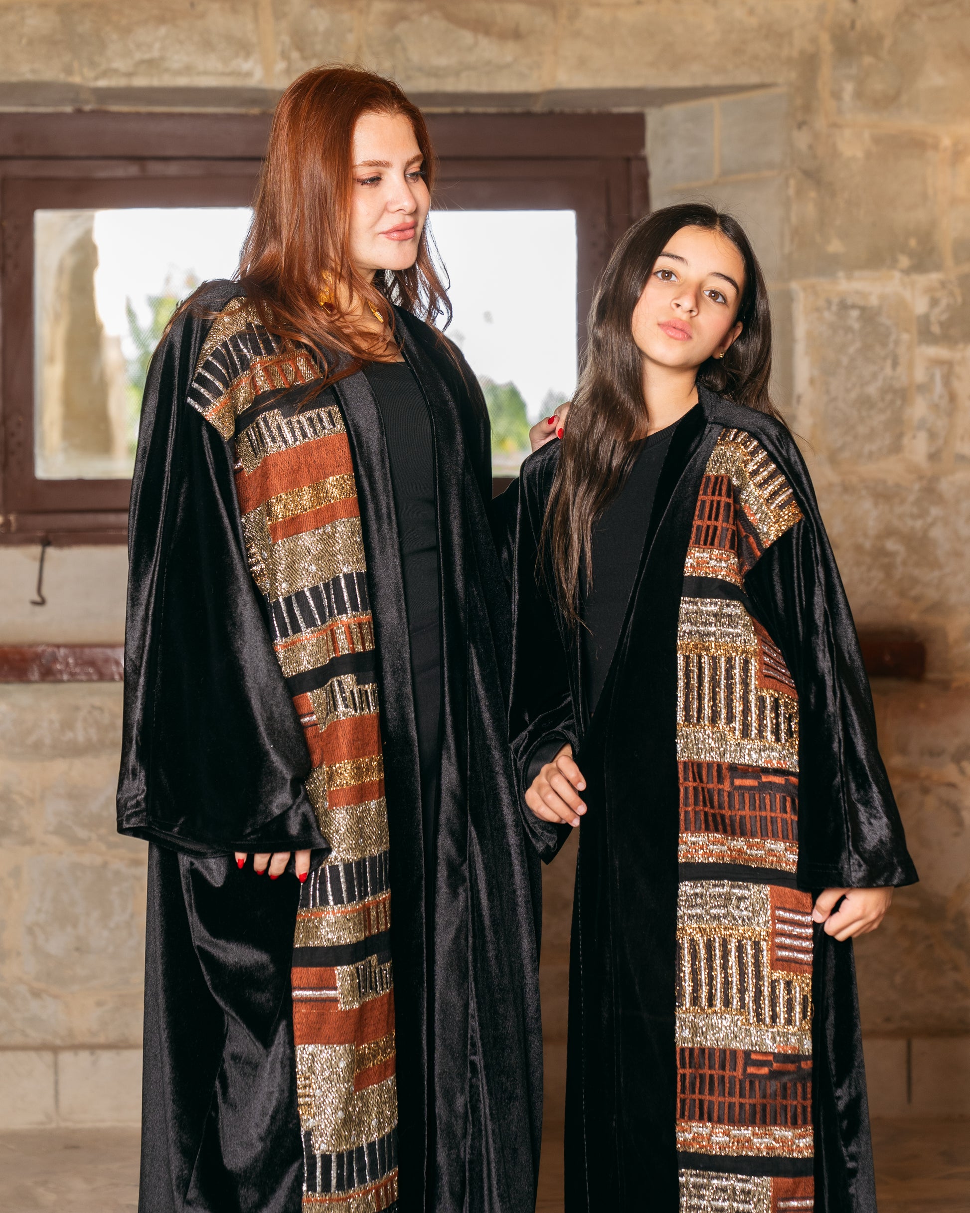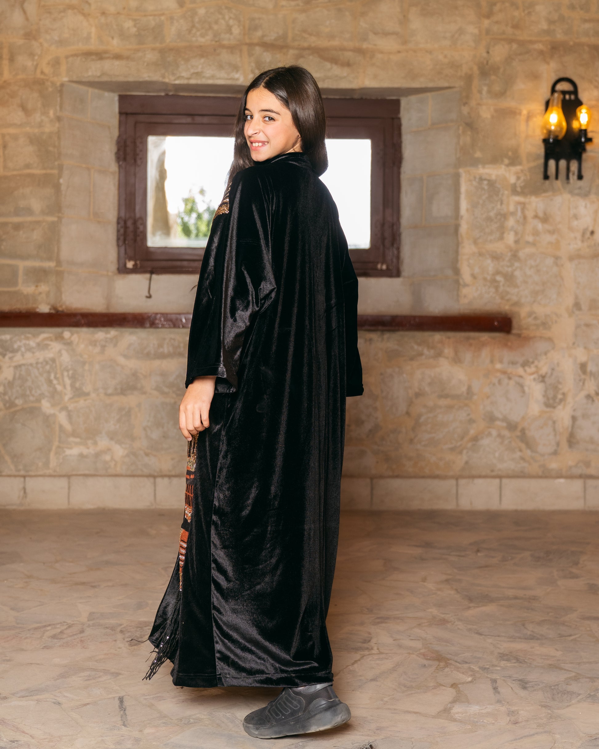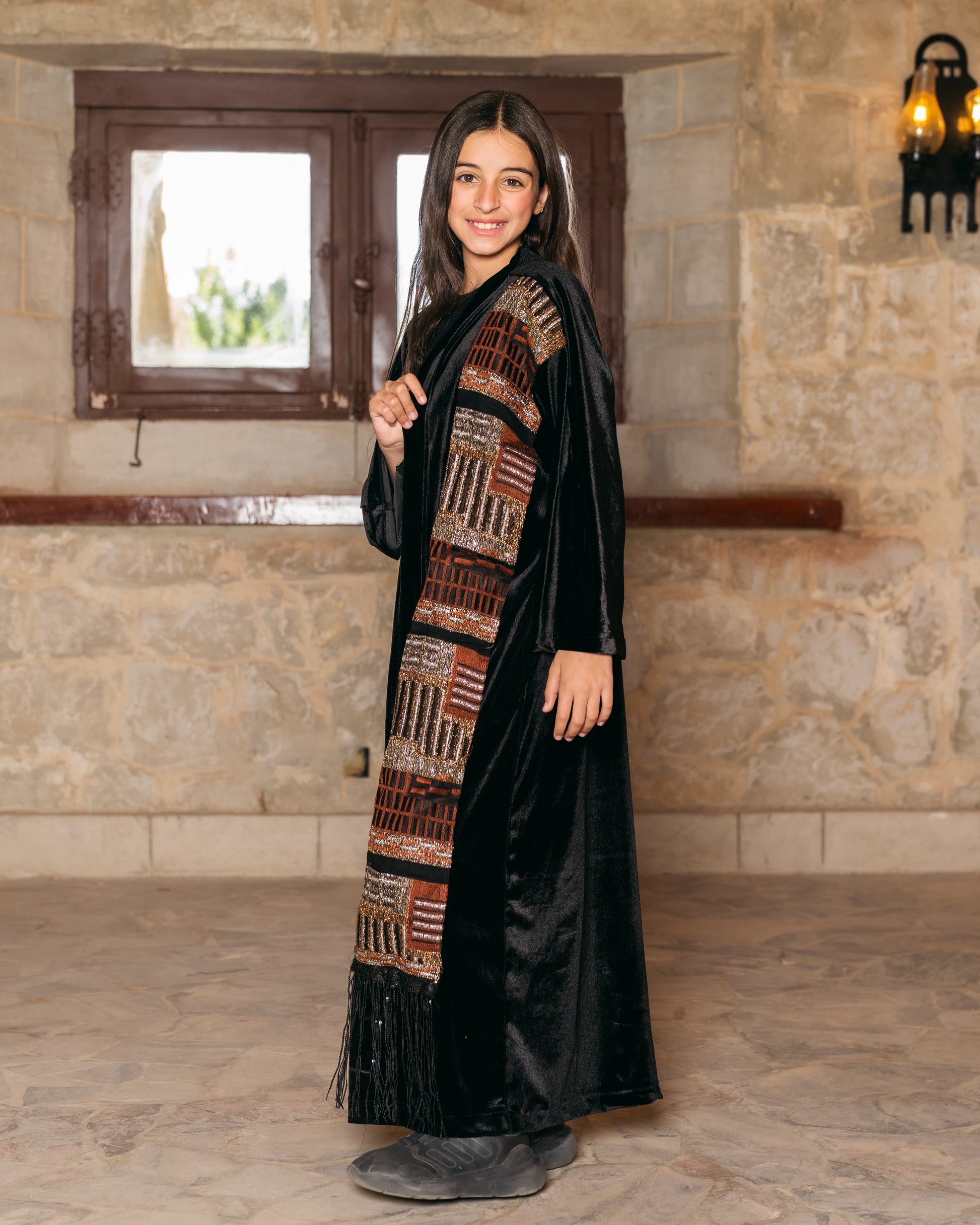 - Features an elegant full-length silhouette highlighted by a striking vertical panel of bronze and gold geometric beadwork for a sophisticated "mini-me" look.