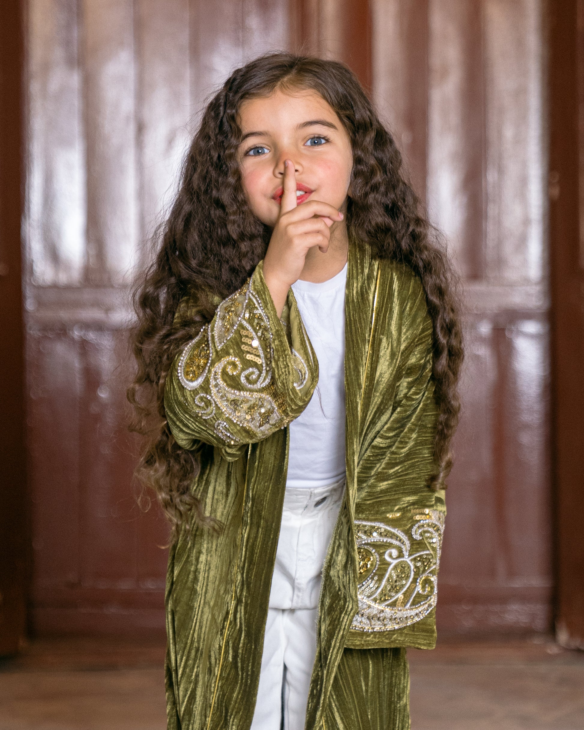 Designed in a rich olive-green crushed velvet that offers a plush, high-luster finish and a cozy, regal feel for the winter season.