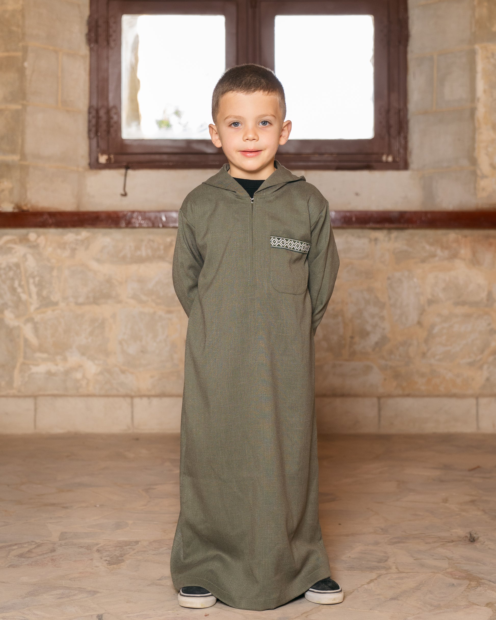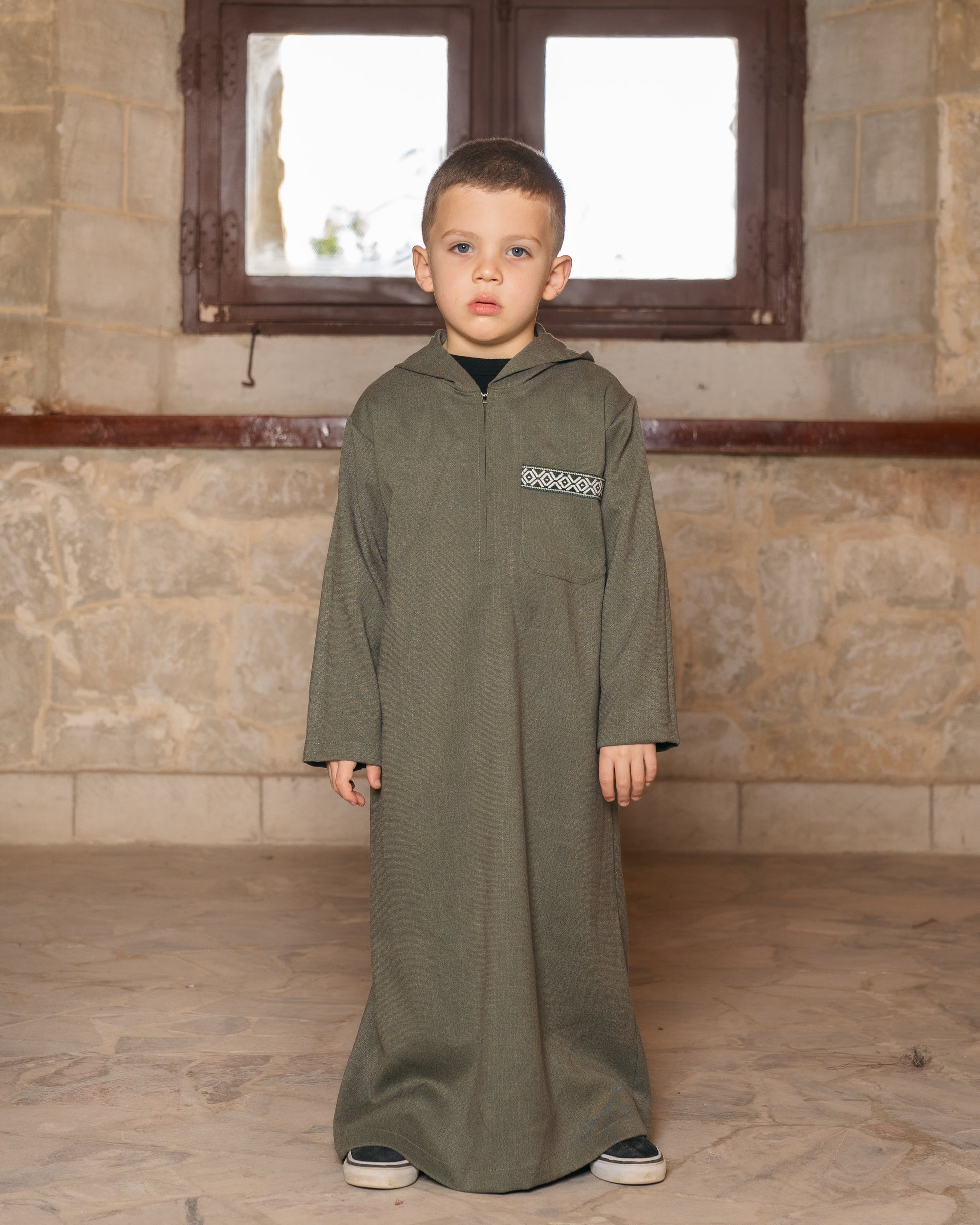 - Features a unique pairing of styles, with a plush olive-green kaftan accented by tiered faux-fur trim for girls and a coordinated hooded galabya with geometric embroidery for boys.
