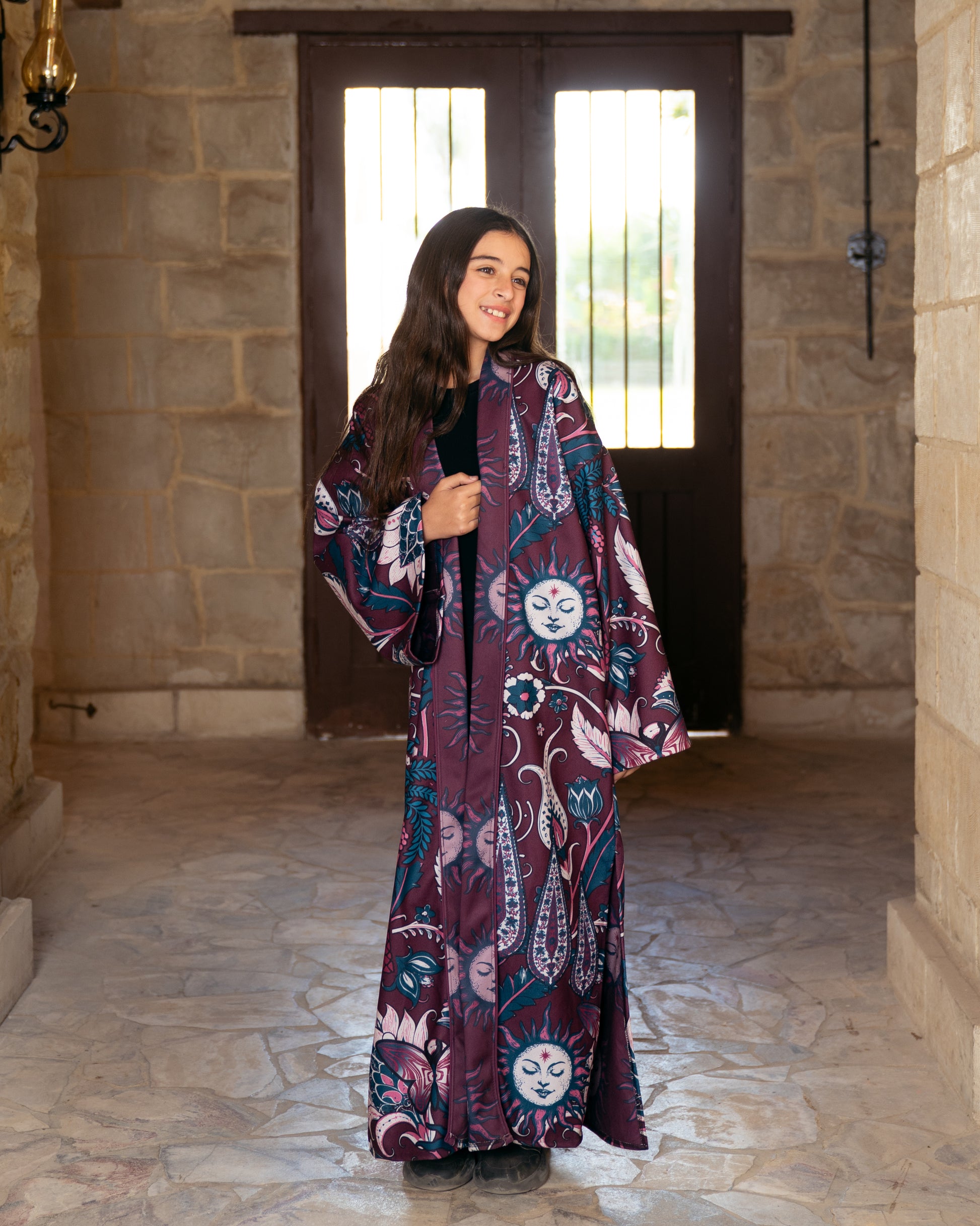 - Features a coordinated pairing of styles, with a bold celestial-printed kaftan for girls and a classic high-collar galabya with a minimalist hidden placket for boys.