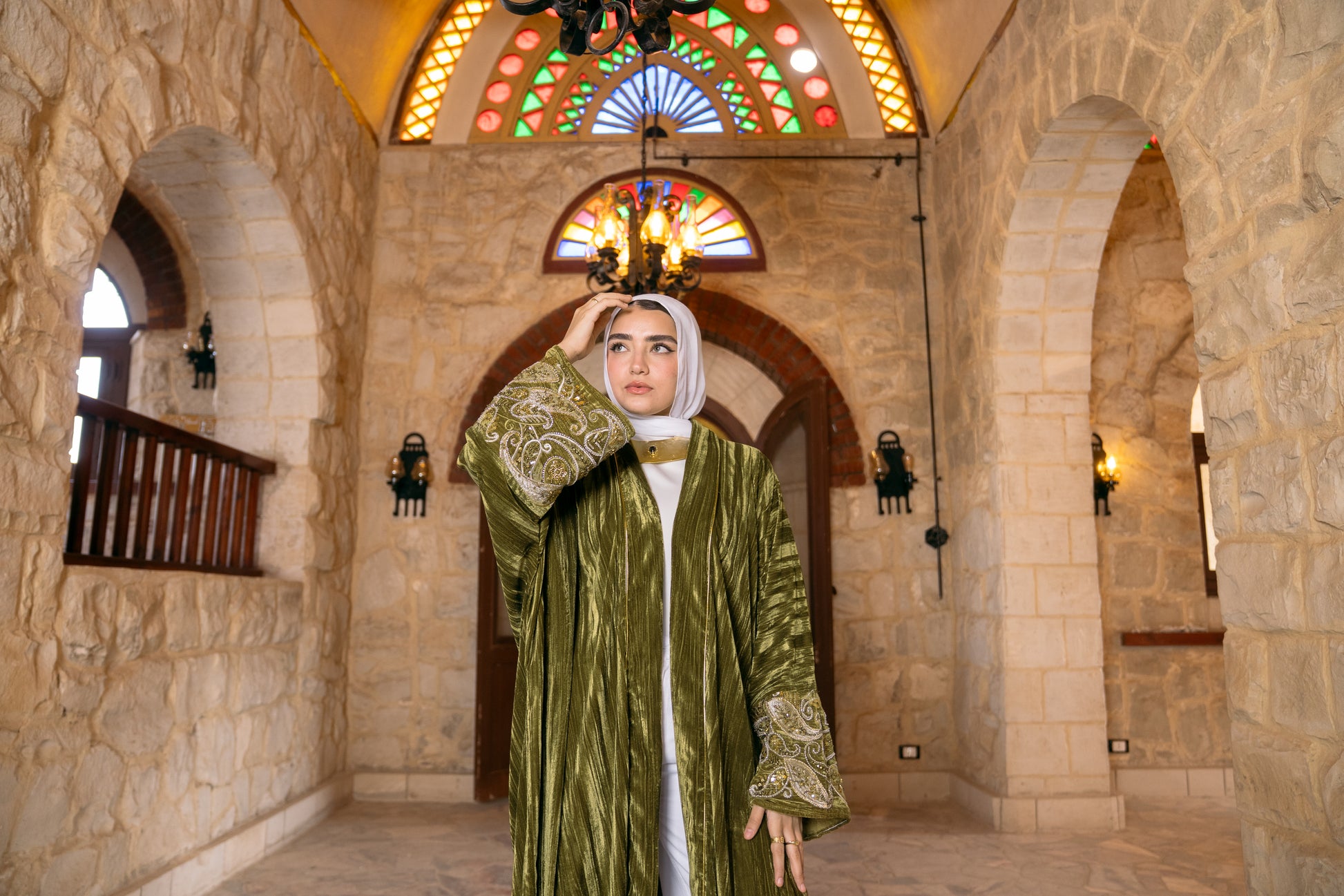 - Features wide sleeves meticulously detailed with intricate gold-thread embroidery and shimmering beadwork.