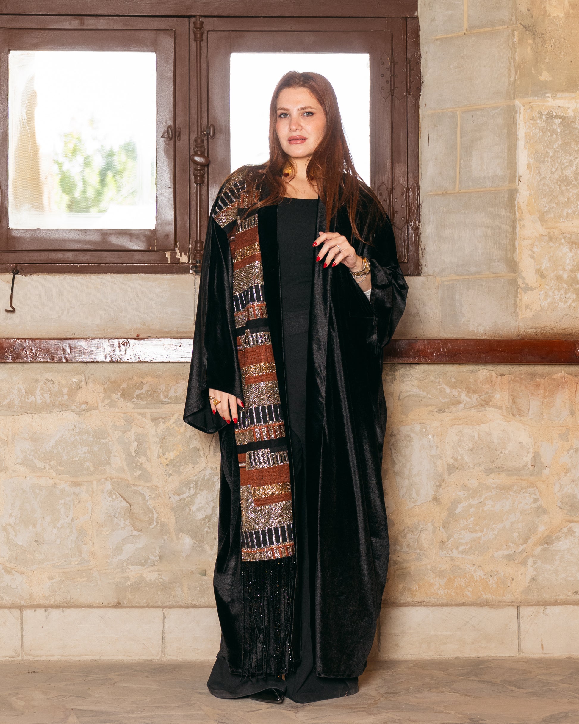 Expertly crafted from deep midnight black velvet that offers a soft, luminous finish and a majestic drape.